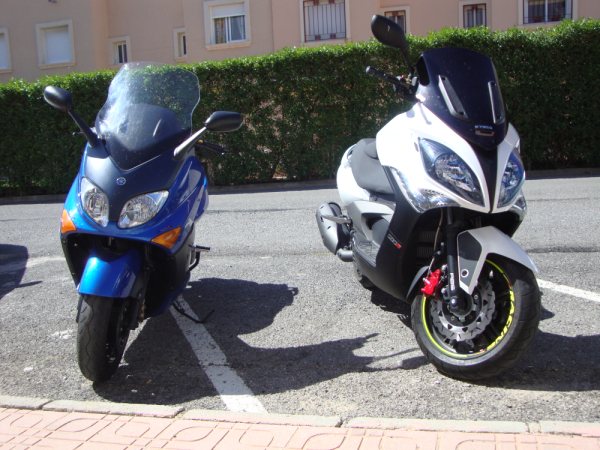 Las alforjas y el resto de equipamiento (trajes, casco, guantes) que ves, tanto en la xc como en la Tmax, lo hemos comprado en la tienda de un amigo: