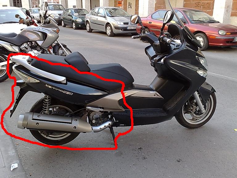 Hola. Desde hace un tiempo, me he dado cuenta que cuando la moto se me moja, despues tiene problemas para arrancar bien. La primera vez me sucedio despues de lavarla con manguera en un tunel de lavado, pero hoy tan solo se ha mojado por la lluvia la parte trasera (derecha ) que esta dentro de la marca en la foto . ¿ Hay alguna parte de la moto en esta zona, que al mojarse de problemas ? Es como si no diese chispa. Para arrancarla, tengo que abrir 3/4 de acelerador y contacto. |