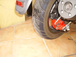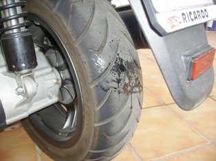Con un mal sabor de boca y con una gran impotencia, no se que hacer y sigo devanandome lo sesos, hasta que un día cenado me dice mi hija, sabes he visto al gato del vecino otra vez por el jardin, estaba junto a la moto, salgo disparado hacie fuera y miro el neumatico trasero, ahí esta la mancha de nuevo, aparecio la pérdida de