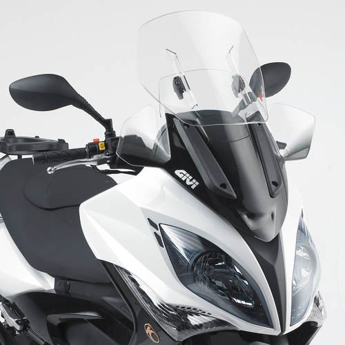 Parabrisas especifico, "extensible" y transparente para Kymco Xciting R 300i-500i (09), con incluido kit de anclaje. Altura (H) máxima 80 cm (12 cm extensible), ancho (A) 61 cm.