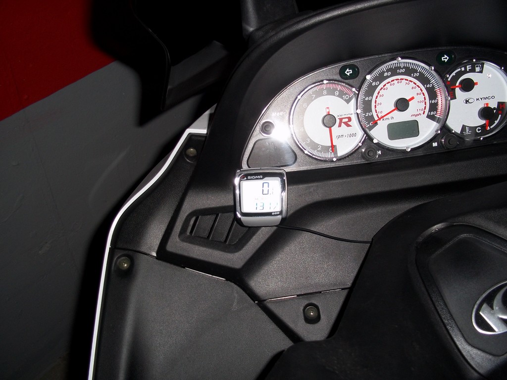 El cable del velocimetro lo he metido por el hueco que queda entre el manillar y el plastico del "salpicadero"y e fijado el porta velocimetro debajo del reloj cuenta revoluciones, luego e seguido el recorrido del cable de freno asta la pinza, que es tambien por donde pasa el cable del velocimetro de fabrica.