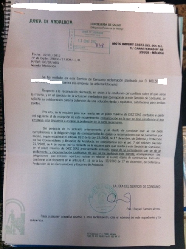 A continuacion si se da el caso de la negacion como digo se adjuntara todos los casos de contestacion negativa y yo personalmente entregare a consumo la documentacion debidamente acreditada y entonces consumo actuara con la sancion que oportune correspondiente mas la entrega a la fiscalia de la documentacion para que actue judicialmente contra Kymco España.