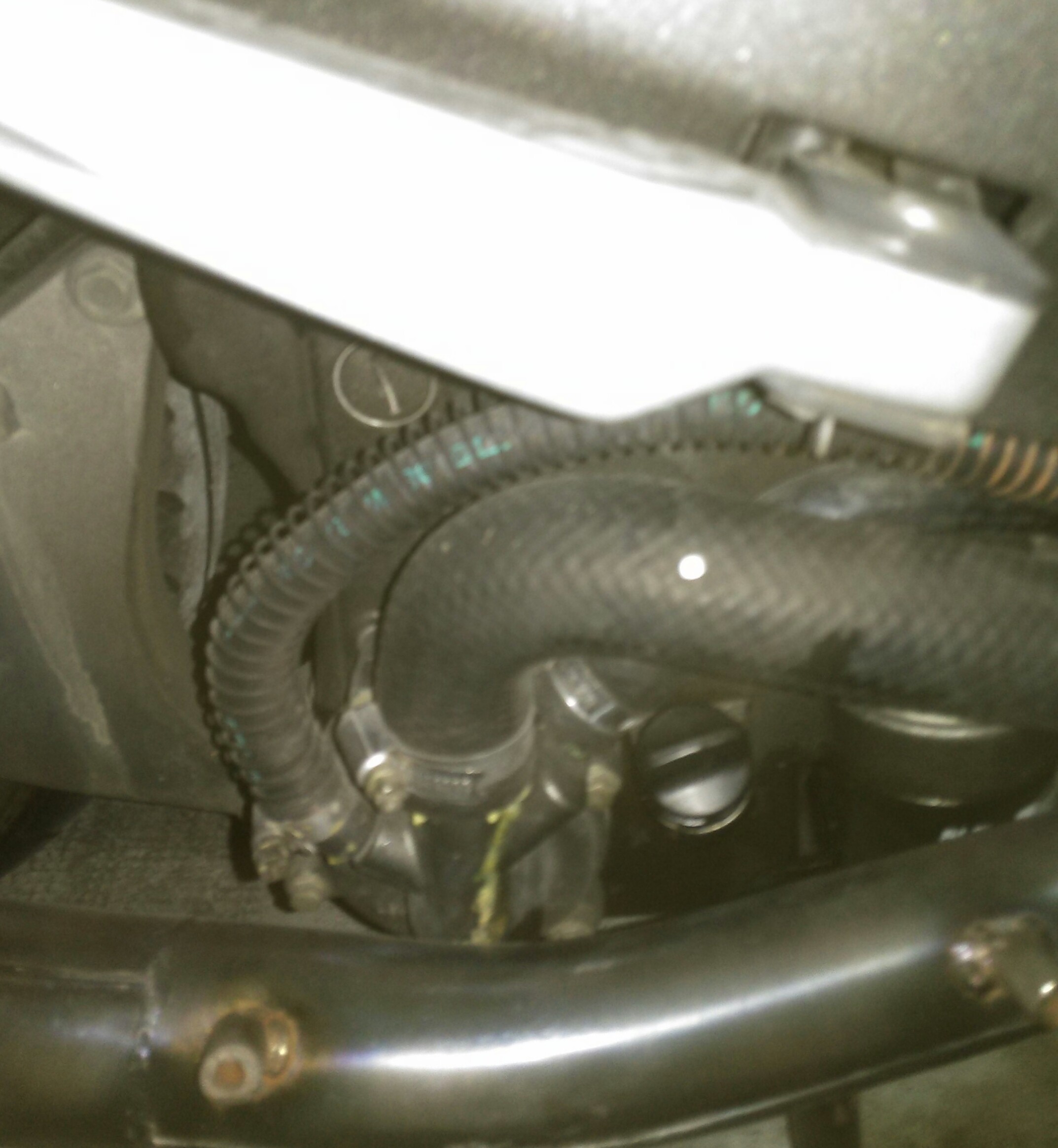 Pues si no estoy equivocado(la mia tambien a resudada)eso(al menos en mi caso)es la bomba del agua-tubo que le viene de arriba,pero vaya resudar de ahi a mancharteeeeee,pues hay una gran dif