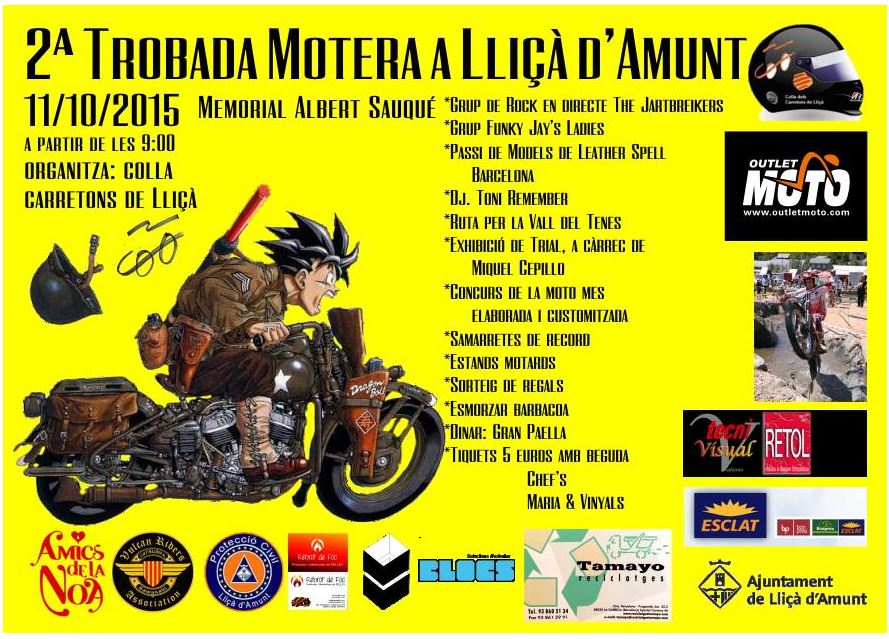 Por solo 5 euros tienes derecho a BOCATA VARIADO Y BEBIDA + TRIAL INDOOR A CARGO DEL CAMPEON DE CATALUNYA+ GRUPO DE ROCK EN DIRECTO + DJ TODO EL DIA +RUTA + SORTEO DE REGALOS+ EXIBICION DE BAILE + CHIRINGUITOS MOTEROS+ RUTA TURISTICA CON BIRRA AL FINAL DE LA MISMA Y ADEMAS COMO L AÑO PASADO AYUDAREMOS A LOS PADRES DE LA NOA A QUE PUEDA CON NUESTRA AYUDA RECIBIR ESOS MEDICAMENTOS QUE NECESITA