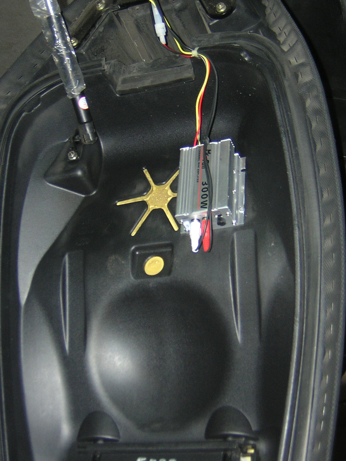 esta es una etapa de potencia quecompre en ebay de 300w por solo 27 euros y la he colocado bajo el asiento en un rincon que no ocupa lugar