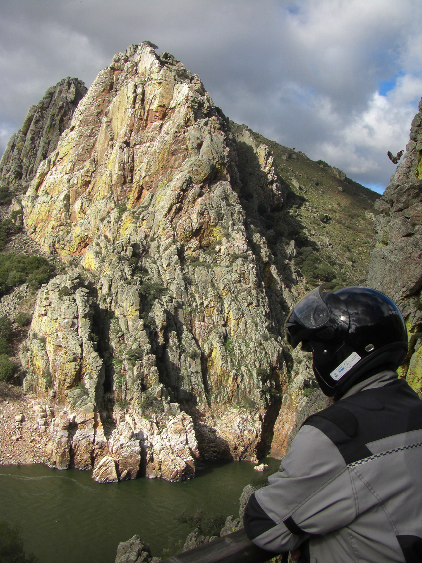 Sabíamos que nuestro amigo Antonio se encontraba por el lugar y dimos con él, estaba tiritando de frío, viendo un partido que jugaba su hijo. Joer que frío hacia. Después de unas charlas le dejamos con su responsabilidad de padre y proseguimos ruta. Decidimos volver por la carretera de Torrejon el Rubio ( EX-390), lo que hicimos. Carretera en magnificas condiciones, paisajes de la llanura de Cáceres, nos vamos adentrando poco a poco en los terrenos del Parque Nacional de Monfragüe. Llegamos a Torrejon el Rubio y preguntamos por una panadería, nuestra rutas sin pan de pueblo de leña, no serían iguales, jeje. Compramos un pan cada uno y seguimos hasta llegar a Peñafalcon o Salto del Gitano.Este sitio es obligatorio parar y disfrutar de los buitres y otras aves y especialmente del entorno.