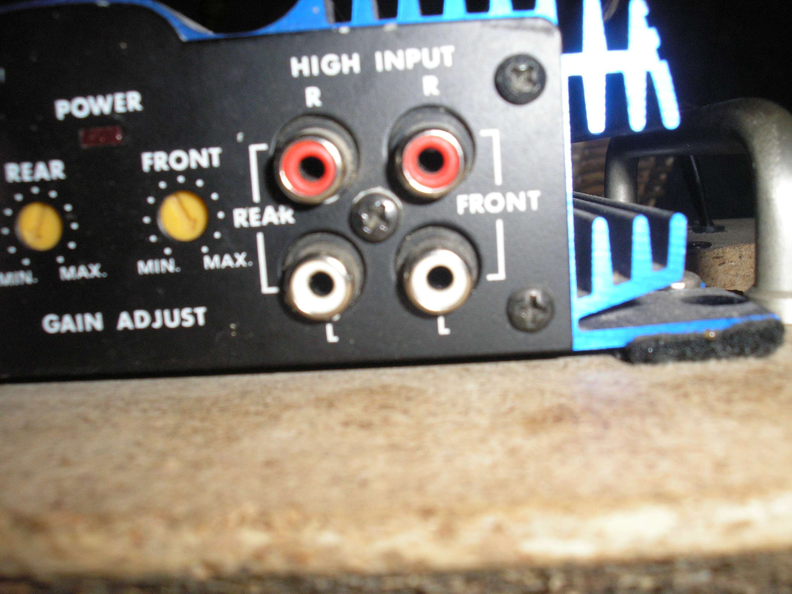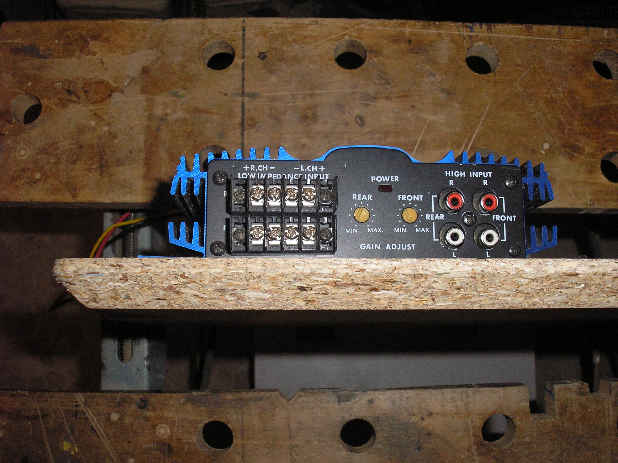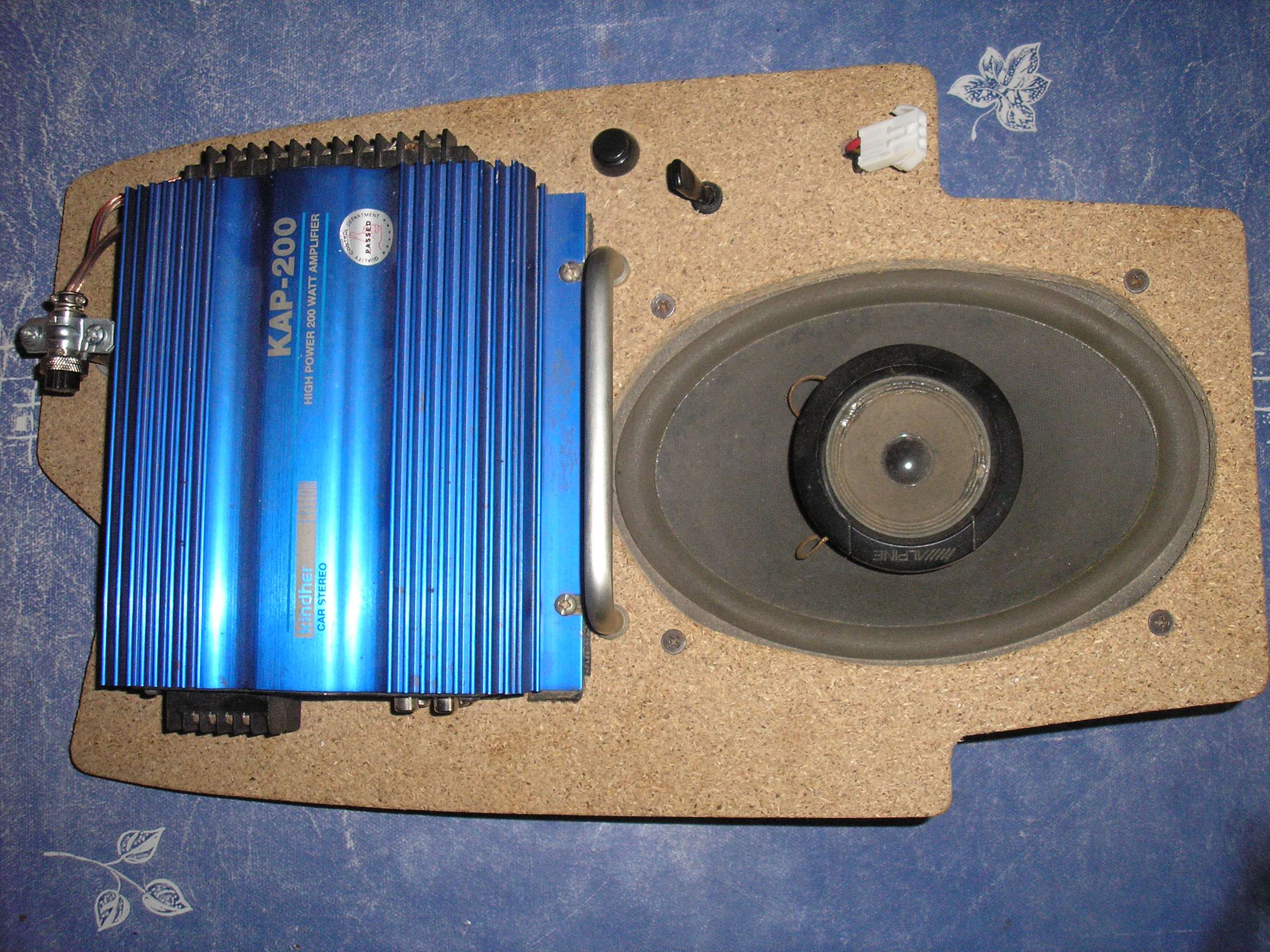 La base está hecha con aglomerado, biselado en la parte inferior para que asiente mejor en el hueco bajo el asiento y lleva: El altavoz anteriormente mencionado, amplificador 50 Watt X 4, portafusible, interruptor/pulsador on/off ( para si algún día llevo puesto el "cacharro" y no voy escuchando música, no consuma corriente), interruptor/conmutador (conecta/desconecta el altavoz de 6X9, pues es un poco inutil cuando el sillón está cerrado), conectores para altavoces y alimentación (el ipod conecta directamente al amplificador mediante RCA), asa para transportarlo.