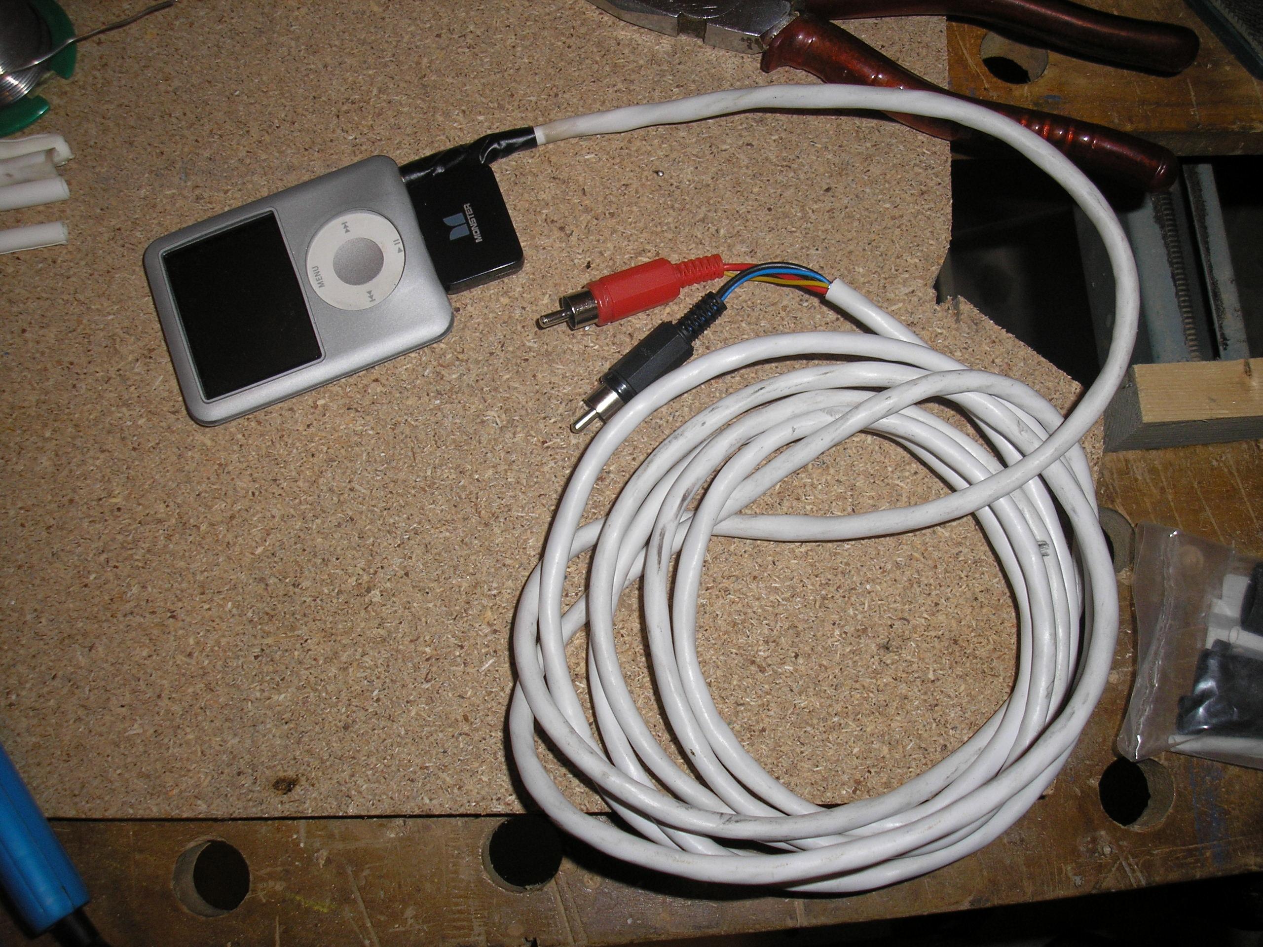 El cable que conecta el ipod al ampli lleva una clavija minijack stereo en un estremo (tuve que quitarle el capuchón y poner cinta aislante porque no entraba en el ipod con el receptor puesto), y dos clavijas RCA al otro extremo. Los altavoces del baul conectan tambien mediante conectores RCA (situado entre los altavoces en el baul y, en la tapa que está tras el asiento, en la moto) a traves de un cable en espiral (utilicé el de una afeitadora).Los RCA de moto y baul van protegidos por unos tapones de goma especificos para estos conectores cuando no llevo el aparato de música.