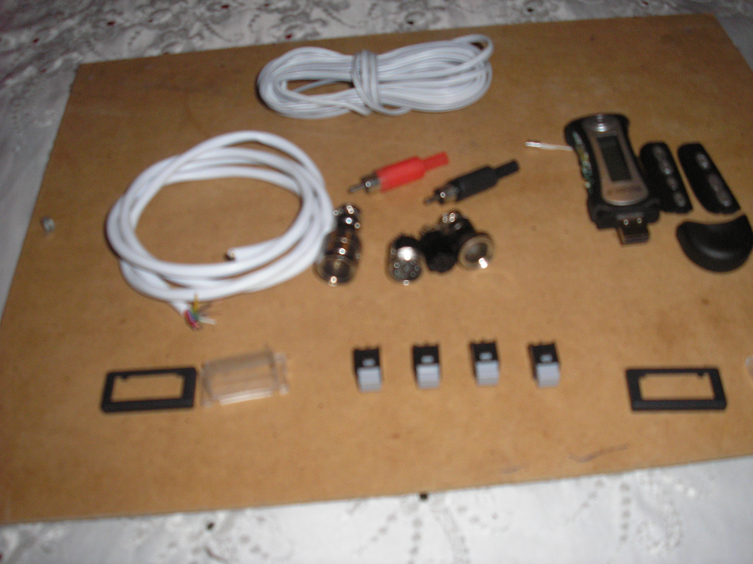 Para llevar a  cabo la 2ª premisa opté por sustituir los pulsadores que lleva el MP3 por los que difícilmente pueden apreciarse en el centro inferior de la foto (son los 4 de color gris y negro). Éstos irían integrados a ambos lados de la tapa superior del manillar e irían conectados a una parte de un conector de al menos 8 pines.Los marquitos negros que están a izq y dcha de la foto alojarían la goma protectora transparente (al lado del marquito izq) para proteger los pulsadores de la lluvia, del mismo modo que habréis visto alguna vez en algún interruptor de exterior.