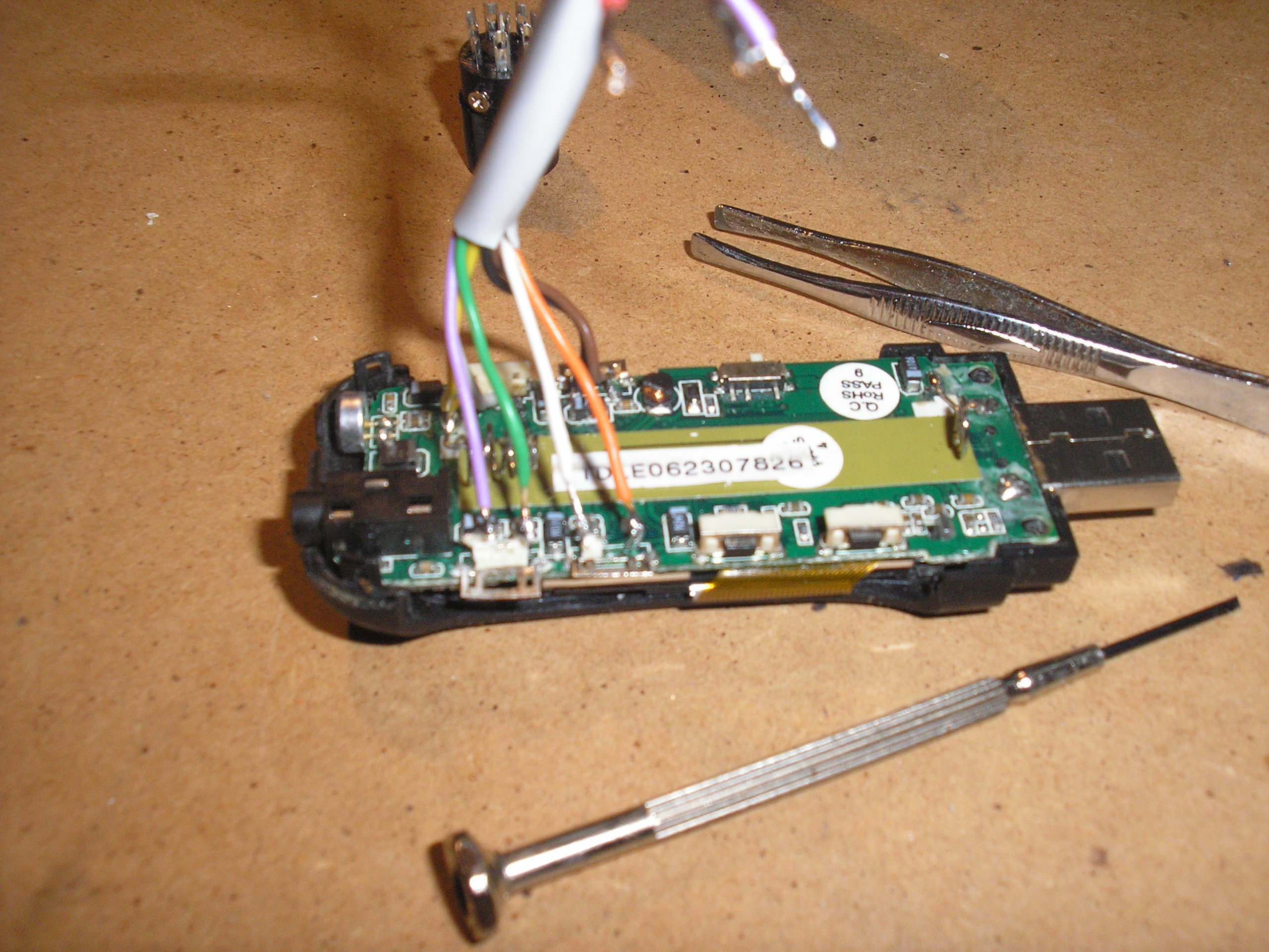 Aquí el mp3 con los cables soldados en los puntos donde se encontraban los micropulsadores.Para realizar estas soldaduras utilicé un soldador (de los de todo a cien) al que limé la punta hasta dejarla como la punta de un punzón.