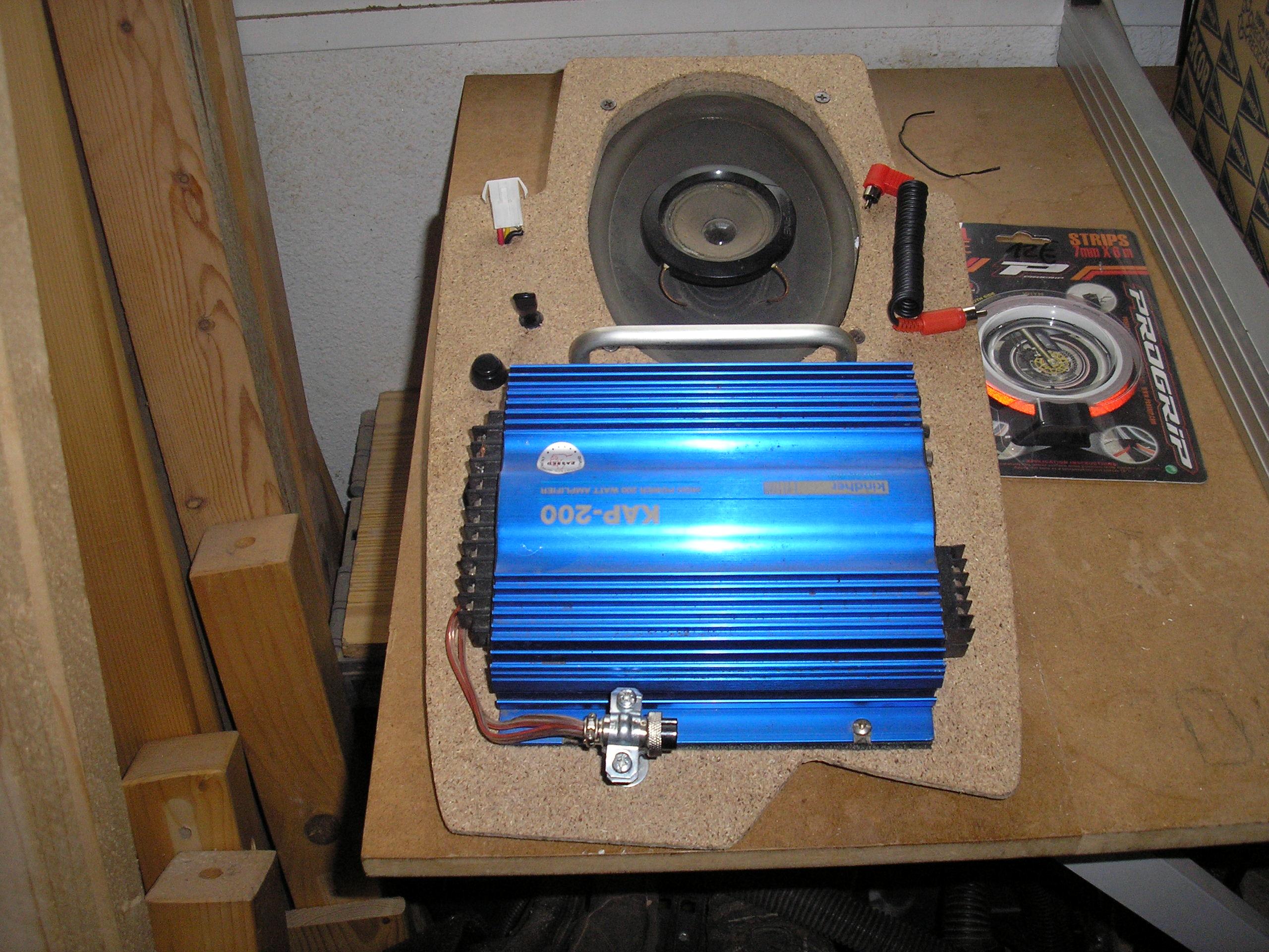 hola javierillo!!  yo mas o menos llevo lo mismo,,,pero la diferencia esk la etapa de potencia tiene RCA para entrada AUX , llevo un interruptor debajo el asiento para encenderla y apagarla ,los altaboces en la rejilla del salpicadero y tuiters en la cupula,,el cablble RCA sale por la guantera pekeña y llega hasta el manillar dnd va un soporte para lo k sea,,hay conecto  MP3,MOVIL,PSP GPS ETC....  y suena de maravilla,,el volumen y cambio de pista y todo lo uso desd los aparatos,,suena genial..todo eso lo llevaba en mi otra exiting y mañana sabado lo montare en la mia,,hare fotillos y asi lo veis,,hay un post mio dnd llevaba un radiocd mp3 pero es muy incomodo,mejor etapa con entrada aux....