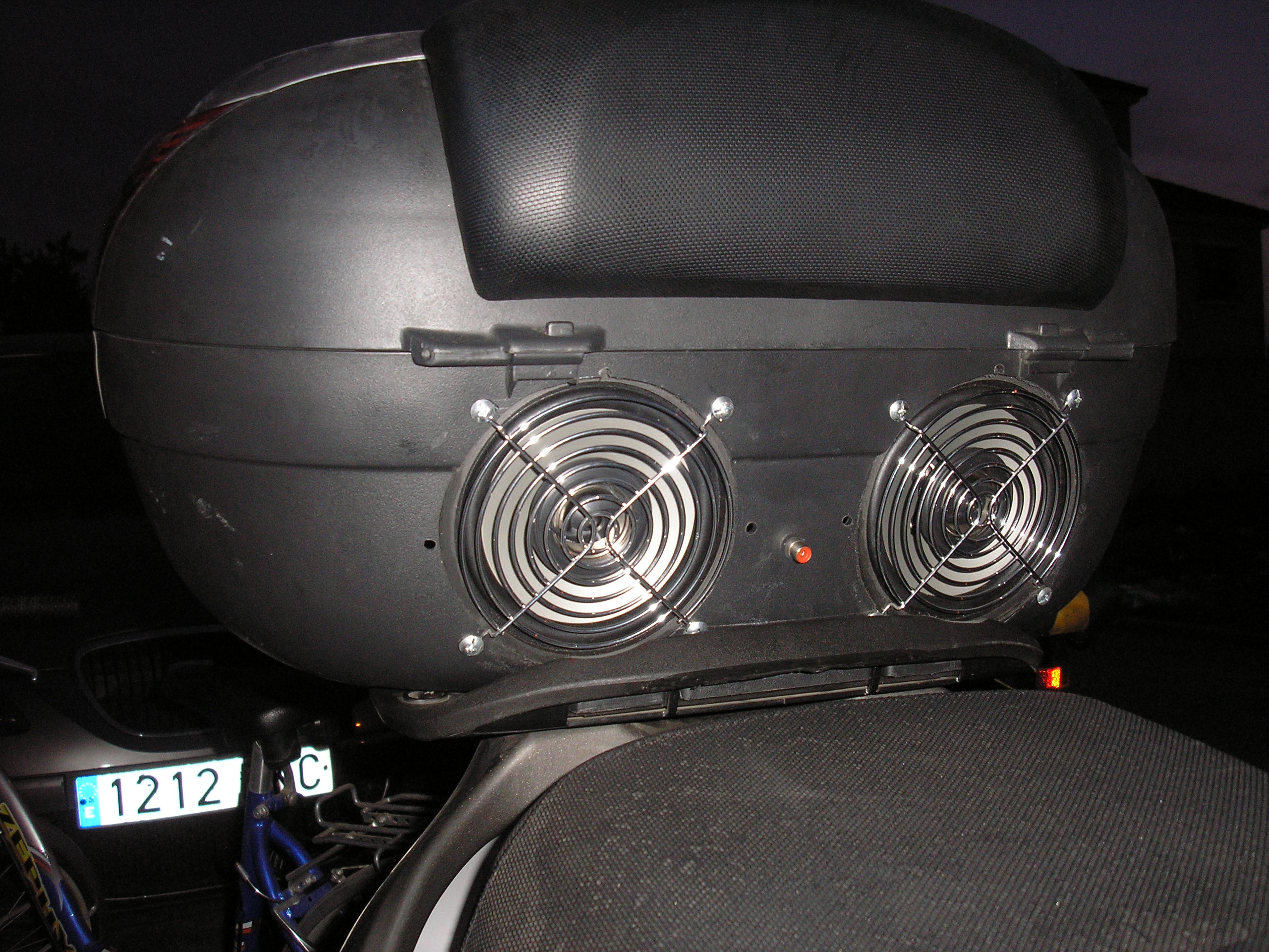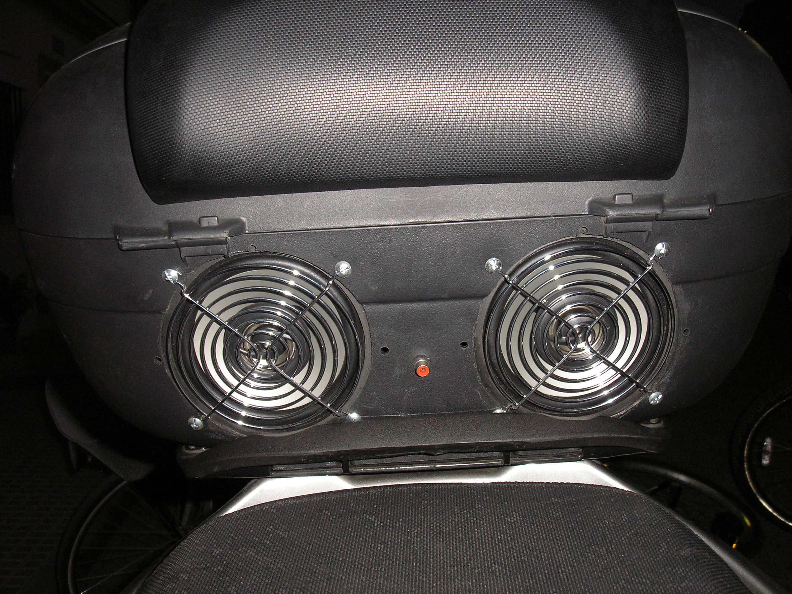 En el baul no se pueden poner los embellecedores de los altavoces porque topan con la base del mismo baul, es por ello que utilicé unas rejillas de ventilador de PC, a los que les tuve que cortar 1/4 de la última vuelta porque también topaban. El resultado queda un poco tuning ¿no os parece?.