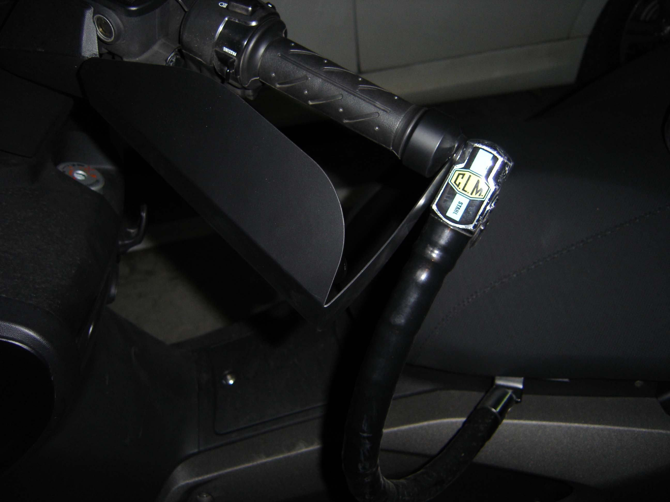 Simplemente agradecer a Manelesc la gestión de poderle adquirir los últimos cubremanos que le quedaban sin pintar. La modificación ha sido simplemente hacer el agujero de la zona del contrapeso más amplia y soldarla al soporte del candado que tengo del manillar. Y pintarla de negro mate com el resto de la moto.