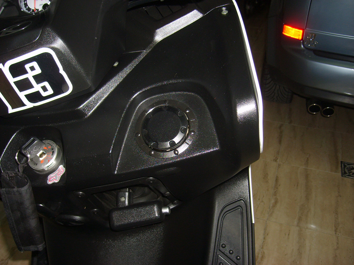 El tapon ha sido aun mas facil, he abierto el tapon (con la llave de arranque, sin desmontar el tapon, como cuando ponemos gasolina) y he cubierto con celo y papel de periodico todo el redondel donde va el tapon, una vez todo bien cubierto por celo + papel de periodico he cerrado el tapon y he pintado y lo mismo, cuando se ha secado he quitado todo el celo y listo. Pintar el soporte y el tapon costará unos 10/15 minutos.