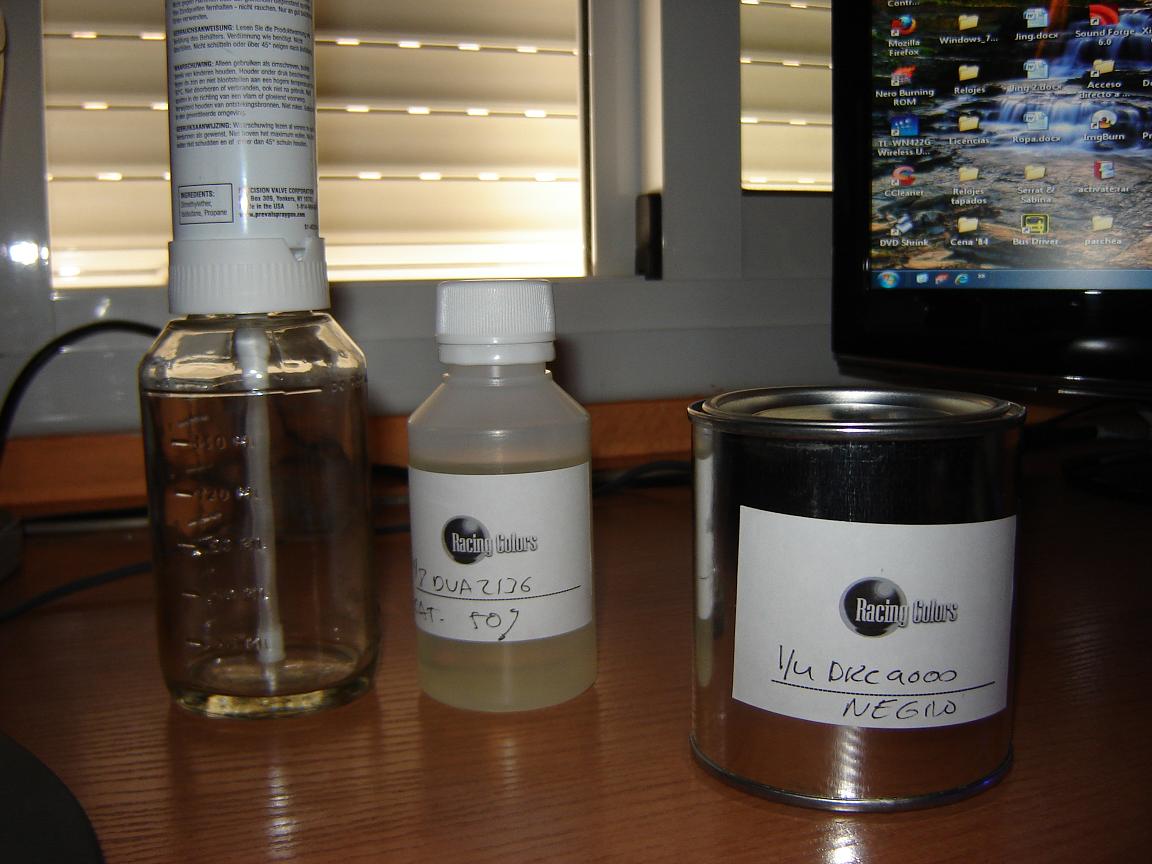 Primero la pintura, es especifica para pintar toda clase de superficies, hasta vidrio. Pintura negra, catalizador y sprayer.