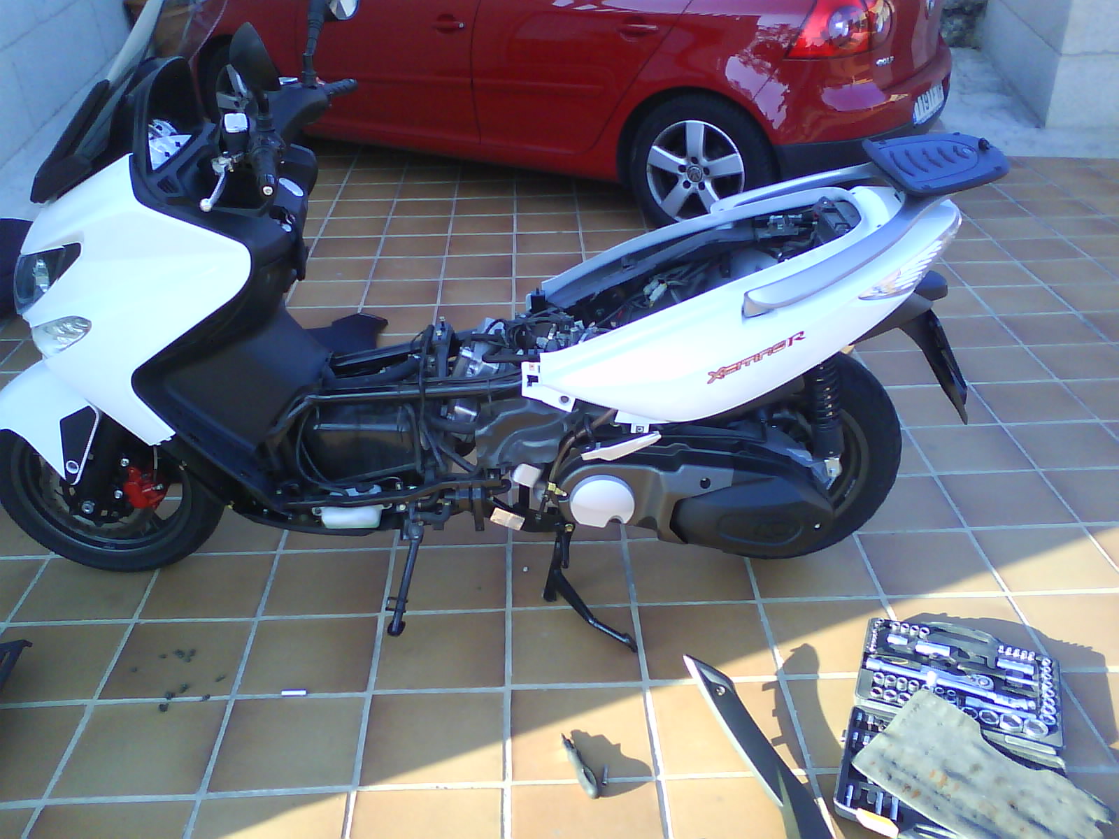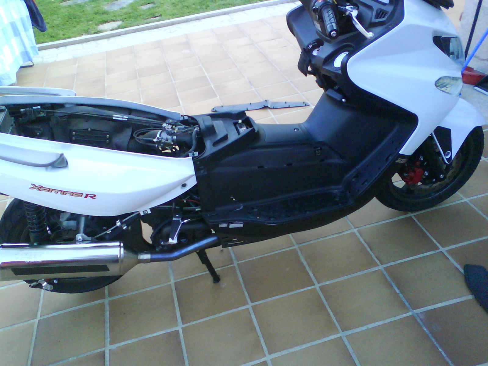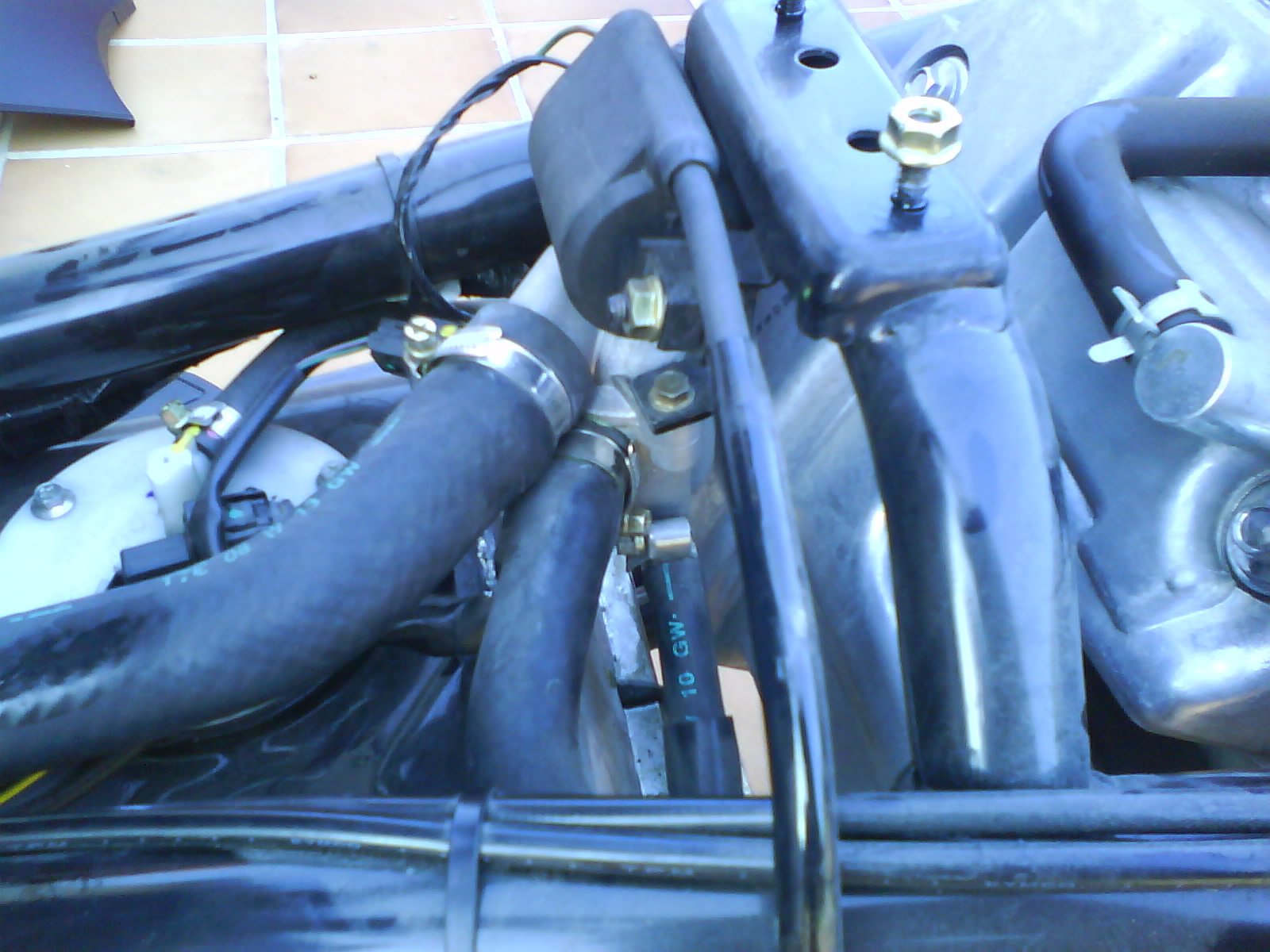 Hola amigos: llevo una temporada apreciando que falta anticongelante y que cada 2500Km tengo que rellenar el vaso de expansion y no sabia si lo consumia o lo perdia o que se yo y hoy he visto una mancha debajo de la moto y decidi investigar. Se veia mojado tambien en el papel anticalorico de deposito pero no se veia de donde venia la fuga asi que manos a la obra, hay que operar.