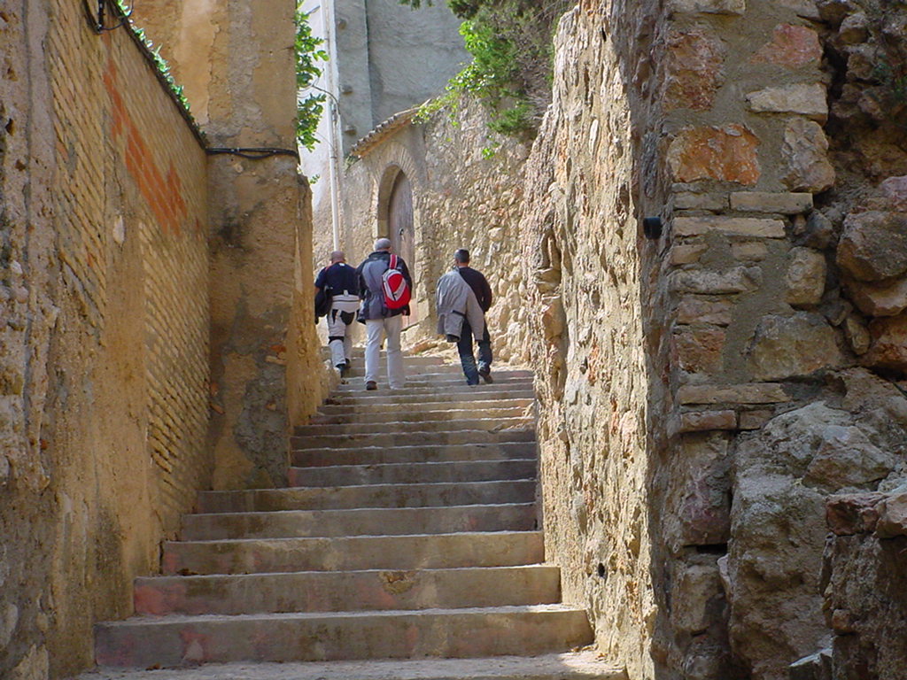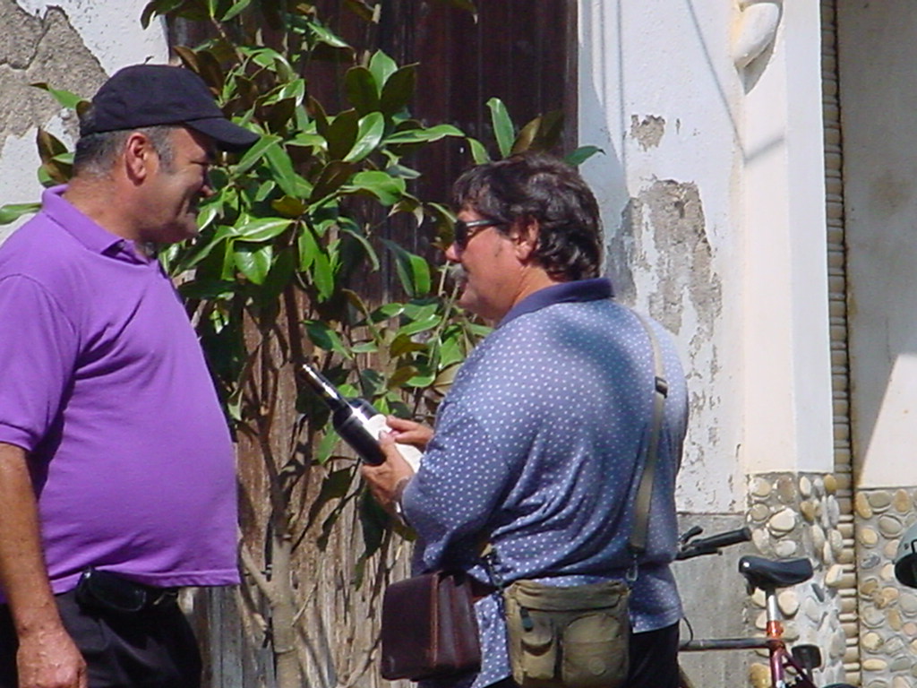 El calor aprieta, fuera chaquetas, motos a la barca y "PAL PUEBLO", un paseito cuesta arriba y al llegar a mitad de camino del castillo (afortunadamente) vemos que no vamos a poder entrar porque cierran a las 13:30, en fin bajada a la plaza del pueblo a refrescarnos. Estando en la terraza llega una banda de tios que parece que lleguen de Kosovo, machetes, cananas llenas de balas ? si,si balas, no cartuchos. Pero esto "que eh lo que eh"? al momento una C15 con un jabalí encima, chorreando sangre.