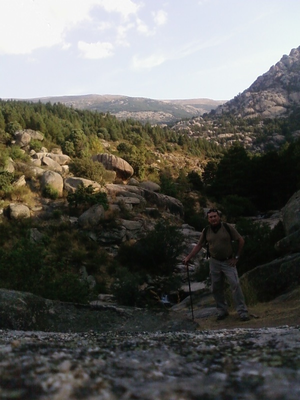 LLego exahusto a la pista, esa pendiente era casi de escalada, y ya muy cómodamente comienzo el descenso por la pista a buen ritmo (es cuesta abajo y la mochila pesa menos). A mi izquierda puedo contemplar durante todo el trayecto el río y las inmensas moles de granito que dan a la mañana una singular vista. Ya se empiezan a ver muchos excursionistas por la zona.