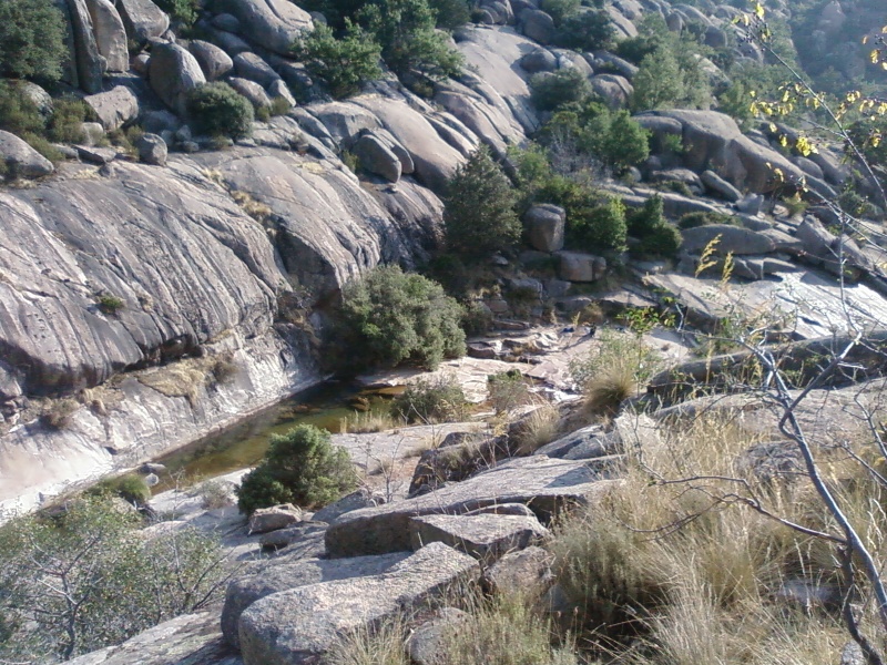 Llego a la Charca Verde, un paraje en donde entre grandes rocas de granito rosado se embalsan las aguas del río formando piscinas naturales de gran belleza. Aprovecho para hacer un alto en el camino y comerme el bocata para recuperar fuerzas, a la vez que admiro ensimismado las caprichosas formaciones graníticas que me rodean por todos lados.